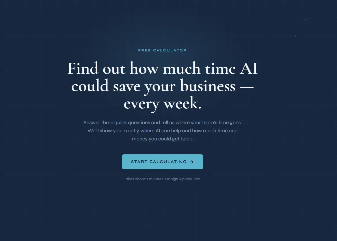 Answer three quick questions and tell us where your team's time goes. We'll show you exactly where AI can help and how much time and money you could get back.